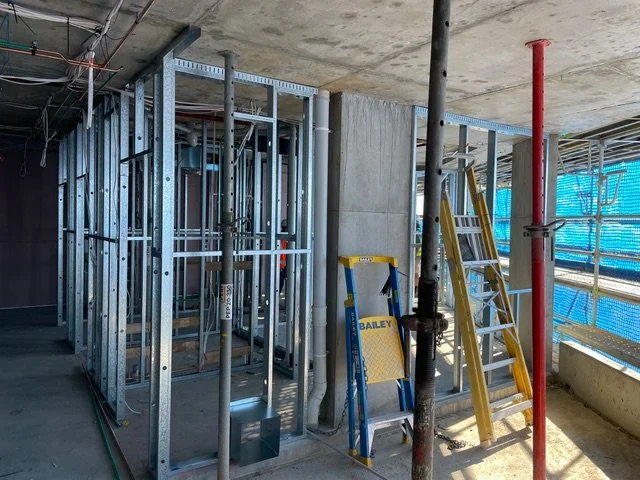 Internal construction is under way and plumbing, electrical and fire services fittings are all in progress.